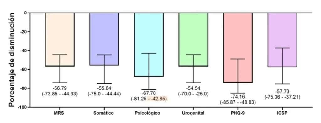 El estudio informa una reducción del 56% en la sintomatología global (MRS) a los 6 meses. Es decir, muchas mujeres pasaron de sentir síntomas que interferían con su día (bochornos, sudores nocturnos, cansancio, irritabilidad) a experimentar una carga sintomática mucho menor; el tratamiento cambió la experiencia diaria de forma palpable.